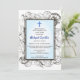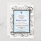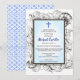 Une collection de coquillages entoure un simple cadre double sur cette invitation de baptême. Une croix bleue accentue le haut. Le dos présente un motif marin pour compléter le thème.
