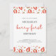 Belle et simple invitation de premier anniversaire avec le thème de la baie premier anniversaire, idéal pour les premiers anniversaires de fille. Cette invitation a été illustrée et conçue par Patricia Alvarez.