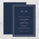 Ces invitations de mariage élégantes et modernes présentent un design minimaliste simple bleu marine et blanc, avec un cadre classique à la frontière. Ajoutez vos initiales ou votre monogramme pour les rendre complètement vôtres.