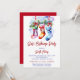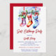 Chaussettes d'aquarelle de fête de Noël accrochées à un ruban rouge sur une branche de pin flocons de neige police décontractée modèle invitation instantanément télécharger.