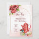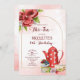 Modèle de l'invitation à la fête du thé. Fleurs rouges, poêle à thé à pois rouge polka, tasse à thé, et un cupcake, aquarelle. Très agréable pour tout âge.