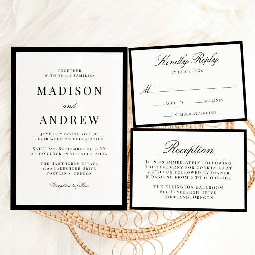 Set the tone for your wedding celebration with this elegant black and white wedding invitation, framed by a bold black border and featuring the couple’s names in graceful black calligraphy. The wedding details are presented below in refined serif lettering, creating a timeless, formal look that feels both classic and modern. Perfect for traditional, black-tie, and contemporary weddings, this design offers a clean, sophisticated aesthetic that pairs beautifully with a wide range of venues and styles.