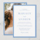 Create a fresh and airy first impression with this light blue photo wedding invitation. The front features a timeless combination of serif lettering and graceful script, framed by a light blue border that adds a calm, polished feel. On the back, your vertical engagement photo is showcased inside a coordinating border, tying the suite together with a soft, romantic finish that works beautifully for coastal, spring, and summer weddings.