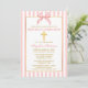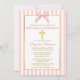 Modern Elegant Pink Blush Striped First Holy Communion Invitation includes Pink and White Stripes, Gold Frame, Gold Cross and Pink Bow Ribbon.