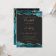 This elegant modern wedding invitation features top and bottom teal watercolor agate borders trimmed with faux gold glitter. The customizable text combines gold-colored handwriting, copperplate and italic fonts on an off-black background. The reverse side features a matching teal and gold agate design.