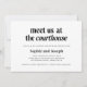 This ultra modern, black and white micro-wedding invitation features bold typography with a mix of standard and italic serif text. The invite says "meet us at the courthouse," and is perfect for an intimate courthouse wedding or elopement. A simple and elegant look that will work perfectly with your modern wedding style.