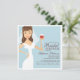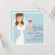Une jeune mariée assez brun-eyed de brune grille la famille et les amis avec un verre de vin dans cette prise moderne à une invitation de Fête de la mariée. Arrière - plan pourpre lilas populaire. Perfectionnez pour une douche vin-orientée ou pour une jeune mariée vin-affectueuse. Texte brun chocolat sur un beau fond de bleu de poudre. En outre disponible :