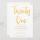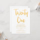 Introduisez une nouvelle invitation moderne et élégante à la fête du 21ème anniversaire, arrière - plan blanc avec texte de typographie manuscrite en or "vingt un". Customisez cette carte de modèle en ajoutant vos propres informations de fête.