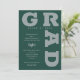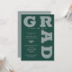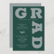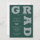 GRAD en lettres grises grises en gras et courbes autour des bords de ces invitations de fête de graduation vert foncé. CORRESPONDANCE d'objets dans notre collection.