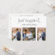 Faire-Part de Réception de Mariage avec 4 Photos - Annoncez votre mariage après votre évasion ou cérémonie privée, et invitez vos invités à votre réception, avec cette carte d'invitation moderne de réception après mariage avec 4 photos. Avec trois photos verticales sur le devant et une photo horizontale au verso, ce design vous offre de nombreuses options. "just married" apparaît en haut de la carte dans une typographie cursive minuscule noire fraîche et décontractée, suivi en dessous de vos noms, date et lieu, dans une police moderne élégante sans empattement. Tous les champs de texte sont entièrement personnalisables - la couleur, la police, la taille et le texte peuvent être modifiés pour répondre à vos besoins. Le verso de la carte comporte toutes les informations d'invitation. Copyright Anastasia Surridge Designs, tous droits réservés.