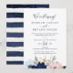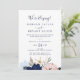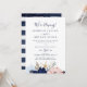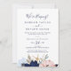Cette invitation de réception de mariage intime moderne sur le thème nautique est parfaite pour une croisière ou une fête après un mariage intime sur la plage. Le design fantaisiste présente des fleurs aquarelles rose blush et bleu marine avec des accents d'étoiles de mer dorées, lui donnant une ambiance balnéaire. Les cartes de RSVP sont vendues séparément, ou vous pouvez ajouter les informations de RSVP au verso de la carte.