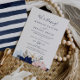 Cette invitation de réception de fiançailles florales nautiques modernes est parfaite pour une croisière ou une fête post-mariage sur la plage. Le design fantaisiste présente des fleurs aquarelles rose blush et bleu marine avec des accents d'étoiles de mer dorées, lui donnant une ambiance balnéaire. Les cartes de RSVP sont vendues séparément, ou vous pouvez ajouter les informations de RSVP au verso de la carte.