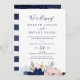 Cette invitation de réception de mariage élopement floral moderne nautique est parfaite pour une croisière ou une fête post-élopement sur la plage. Le design fantaisiste présente des fleurs aquarelles rose blush et bleu marine avec des accents d'étoiles de mer dorées, lui donnant une ambiance balnéaire. Les cartes de RSVP sont vendues séparément, ou vous pouvez ajouter les informations de RSVP au verso de la carte.