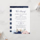 Cette invitation de réception de mariage intime florale nautique moderne est parfaite pour une croisière ou une fête post-mariage sur la plage. Le design fantaisiste présente des fleurs aquarelles rose blush et bleu marine avec des accents d'étoiles de mer dorées, lui donnant une ambiance balnéaire. Les cartes de RSVP sont vendues séparément, ou vous pouvez ajouter les informations de RSVP au verso de la carte.