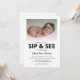 Invitation minimaliste pour une fête sip and see avec un fond blanc, une photo et un modèle d'invitation moderne facile à personnaliser. Tous les styles et tailles de police peuvent être facilement modifiés en cliquant sur le lien 'personnaliser davantage' après la personnalisation.