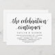 Carte d'invitation sur le thème Moderne Rustique avec écriture noire (avec titre de carte : la célébration continue). Elle est parfaite pour votre réception de mariage intime / fête de célébration post-mariage. Ajoutez vos détails avec une police / lettrage noir assorti.
