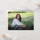 Cette invitation moderne à la fête de remise de diplômes comprend une photo horizontale qui remplit l'intégralité de l'avant de la carte et une deuxième photo fanée sur le dos. Un script d'écriture manuscrite moderne apparaît sur la photo qui dit '25 diplômé. Le texte personnalisé vous permet d'ajouter le nom et l'école du diplômé sur l'invitation avant et de la fête à l'arrière.