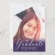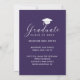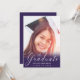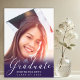 Cette simple faire-part de graduation minimaliste moderne et l'invitation de la fête inclut votre photo sur le devant avec une superposition de script de calligraphie blanche sur violet qui dit "Graduate" avec votre nom et classe/année pour personnaliser. L'arrière de la cour est violet avec un texte blanc avec toutes vos informations de graduation et de fête pour customiser. Conçu par Susan Coffey.