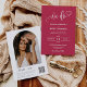 Cette invitation présente une calligraphie élégante "nous nous marions" et une police de caractères simple sans serif avec une photo en forme d'arc et un code QR sur un fond magenta viva. La simplicité et la conception épurée de cette invitation conviennent à tous les thèmes de mariage et constituent certainement un excellent ajout à votre mariage.