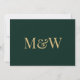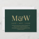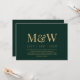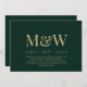 Faire-part de mariage moderne Forrest Green Gold Monogram. Beau design vert et or audacieux avec typographie moderne et initiales de couple. Texte de couleur or sur vert foncé. Personnalisez avec le nom de la mariée et du marié, la date du mariage, le lieu du mariage et ajustez l'échantillon de texte et/ou les couleurs de l'invitation selon votre souhait. Nous vous invitation à visiter notre magasin Austen & Grace, pour voir la suite mariage complète, assortis produits et plus encore. Veuillez nous contacter si vous avez besoin d'aide.