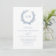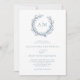 Parfait pour les mariages de plage et nautiques, une couronne de corail encadre les initiales monographiques de la mariée et du marié en haut de cette élégante invitation côtière minimale blanche et bleu poussiéreux. Le dos est d'une couleur bleu foncé.