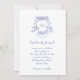 Ces invitations de mariage élégantes, bleues et blanches, présentent une illustration bleue dessinée à la main d'une crête mariage avec des chérubins et des fleurs, et vos initiales ou monogrammes au centre. Le texte est un script manuscrit tendance pour un look fantaisiste et romantique.