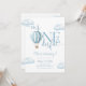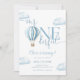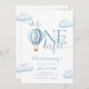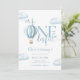 Cette charmante invitation à la première fête d'anniversaire présente un ballon à air chaud bleu mignon et des nuages, ainsi qu'une typographie élégante. Conçue par Thisisnotme©
