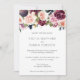 Faire-part de mariage floral moody avec une bordure supérieure avec figues peintes à l'aquarelle, baies et roses en prune et rose. L'arrière est d'une couleur prune profonde et peut être changée en n'importe quelle couleur. Les nuances profondes de violet rendent cette invitation excellente pour un mariage à l'automne.
