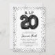 Aménagez vos 20 ans avec nos invitations d’anniversaire adultes uniques. Montrant un arrière - plan blanc pointu avec des ballons d'hélium noir qui expliquent "RIP to my twenties", cette invitation ajoute une touche amusante aux anniversaires marquants. Accentué de bords de parties scintillant noires et d'un modèle de texte d'anniversaire convivial, vous pouvez facilement personnaliser cette invitation pour refléter votre propre style et vos plans de célébration.
