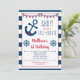 Cette adorable invitation présente nos illustrations d'ancre et de coeur en bleu marine et rouge avec une bordure de bande nautique.