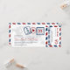 Une carte d'embarquement a inspiré l'invitation de billet avec des détails de timbre de passeport d'amusement et des rayures de par avion. Montré dans les nuances de la marine, du rouge, et du gris. Le dos inclut l'espace supplémentaire pour n'importe quelle information d'hôtel, de voyage ou de site Web.