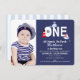 Cette invitation d'anniversaire nautique pour le 1er anniversaire de garçon présente le mot "un" en grandes lettres entouré d'éléments nautiques, une baleine, un phare, un voilier et un gouvernail. Le fond est bleu marine et a un motif rayé léger. Il y a de la place pour une photographie sur le côté. Cette invitation convient comme invitation d'anniversaire pour le 1er anniversaire d'un garçon et est particulièrement adaptée pour une fête d'anniversaire sur le thème nautique.