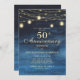 Célébrez 50 ans ensemble avec cette élégante invitation d'anniversaire de mariage bleu marine avec paillettes dorées et guirlandes lumineuses. Contactez-moi pour obtenir de l'aide pour vos personnalisations ou pour demander des produits Zazzle supplémentaires ou coordonnés pour votre événement(s)
