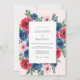 This design features a rich palette of navy blue and ruby red anemones complemented by soft blush roses. The watercolor aesthetic creates a romantic and artistic atmosphere, perfect for a seasonal nuptial. Lush green foliage and vibrant blooms are arranged to accent the central composition.