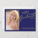 Celebrate your graduate with this elegant navy blue and gold script graduation photo invitation. The design features a sophisticated deep navy background with stylish gold calligraphy “Graduate” lettering and a classic graduation cap illustration. The front highlights a large senior portrait while the back showcases a beautiful three-photo collage, allowing you to share multiple favorite graduation photos.