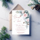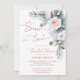 Neige en amour douche nuptiale editable invitation modèle instantanée téléchargement numérique, aquarelle rose roux hivernal roses roses roses sur pins enneigés branches avec cônes de pins flocons de neige nuptiale hivernale cartes d'invitation douche nuptiale hivernale invitations