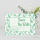 Annoncez votre journée spéciale dans le style avec ce design botanique tropical élégant dans le vert néo-menthe tendance qui dispose d'un joli motif de verdure feuille de palme et de lettrage élégant. Il est facile de personnaliser et le format de carte en fait un choix économique pour les mariages à un budget limité. #neomint #savethedate