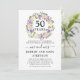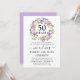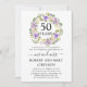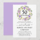 Une jolie et élégante couronne de fleurs violettes et blanches ivoire entoure 50 ans pour couronner cette invitation de fête d'anniversaire de mariage de 50 ans. Le texte est une combinaison de calligraphie moderne et de texte classique droit. La couleur grise complète les fleurs de cerisier.