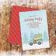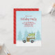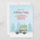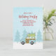Rustic Cute Blue Car ou vintage Woodie wagon avec un Fête de Noël frais coupé Fête de Noël hiver, moderne rustique chic scène d'hiver, country whimsical fun drôle, tendance script de calligraphie, typographie lunaire texte de police, arbres voiture bois voiture voiture, arbre de Noël sur le dessus, simple Noël invitation, famille amis se réunissent, la calligraphie moderne fête de vacances