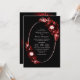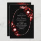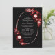 Une élégante faire-part de mariage noire avec un arrangement floral rouge bordeaux rustique sur un cadre ovale.