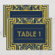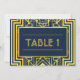 Ces nombres de table présentent un cadre géométrique complexe, des motifs géométriques, une palette de couleurs bleu marine et or, ainsi que d'autres détails stylistiques tous inspirés de l'Art Déco et des années folles. Vous pouvez personnaliser les champs de texte d'exemple à votre goût.