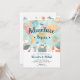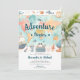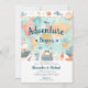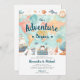 Une invitation pour garçon mignonne, sans sexe, avec un thème voyage et aventure, avec une aquarelle illustrant la carte du monde avec des personnages mignons et des éléments liés au voyage, avec le titre "Notre aventure commence". Parfait pour les futurs parents qui aiment voyager, qui aiment le thème de l'aventure pour un baby shower.