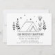 Invitation de Baby shower d'aventure avec des oeuvres dessinées à la main et de la typographie moderne. Tente rustique, fleurs, verdure et typographie lettrée.