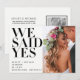 Cette élégante annonce de mariage noir et blanc est un excellent moyen de faire savoir à vos amis et à votre famille que vous vous êtes enfuis, que vous avez eu une cérémonie secrète ou un mariage intime, et que vous souhaitez célébrer avec eux ! La face avant de la carte est conçue pour mettre en valeur votre photo préférée en orientation verticale, avec les mots "Nous avons dit oui" à gauche dans une typographie de magazine de mode intemporelle et élégante en noir. Vos noms, date de mariage et lieu apparaissent en bas à gauche dans une police sans empattement moderne et élégante, et votre photo de mariage verticale à droite. Le verso de la carte vous permet de saisir des informations personnelles sur votre mariage, ainsi que les détails de l'invitation à la réception, et comporte une photo encadrée en noir et blanc en orientation verticale/ portrait. Il s'agit d'un modèle de conception, très facile à personnaliser pour répondre à vos besoins. Merci beaucoup de soutenir notre petite entreprise, nous l'apprécions vraiment !