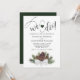 Cette belle faire-part de mariage au design rustique est agrémentée d'un ensemble de pinecones et de branches de pin nouées avec un arc en satin blanc. Le titre est écrit en lettres de script et dit : Nous le faisons! avec un coeur mignon entre les portées. Le dos est une couleur verte de forêt marbrée profonde. Romantique, fantaisiste et élégant, cet invitation est parfait pour un mariage d'hiver, de plein air ou de vacances.