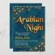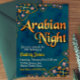 Entrez dans un monde de mystère et soyez enchanté par cette invitation à la Nuit Arabesque. Cette invitation a été rendue spéciale en utilisant une couleur de fond captivante avec des décorations dorées et diamantées pour capturer la vibrance et l'attrait d'une soirée à thème arabe