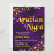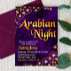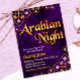 Entrez dans un monde de mystère et soyez enchanté par cette invitation à la Nuit Arabienne. Cette invitation a été rendue spéciale en utilisant une couleur de fond captivante avec des décorations dorées et diamantées complémentaires pour capturer la vibrance et l'attrait d'une fête sur le thème arabe.