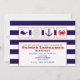 Une invitation orientée de fête d'anniversaire d'océan comportant un arrière - plan des rayures de bleu marine et de blanc sur l'avant et le dos. L'avant comporte des illustrations d'une baleine, de dollar de sable, d'ancre, et d'un crabe à l'intérieur des carrés blancs avec l'équilibre rouge. Personnalisez avec des détails de votre occasion.