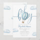 Cette charmante invitation au baby shower comporte une jolie montgolfière bleue et des nuages, ainsi qu'une élégante typographie de script. Conçu par Thisisnotme©
