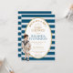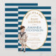 Il y a un ovale blanc avec une bordure dorée contenant du texte. Le texte est écrit en majuscules dorées, à l'exception du nom, qui est bleu marine. Le titre « Ahoy ! C'est un garçon ! » est courbé au-dessus du reste. Le fond comporte des rayures de style marin bleu marine et blanc.